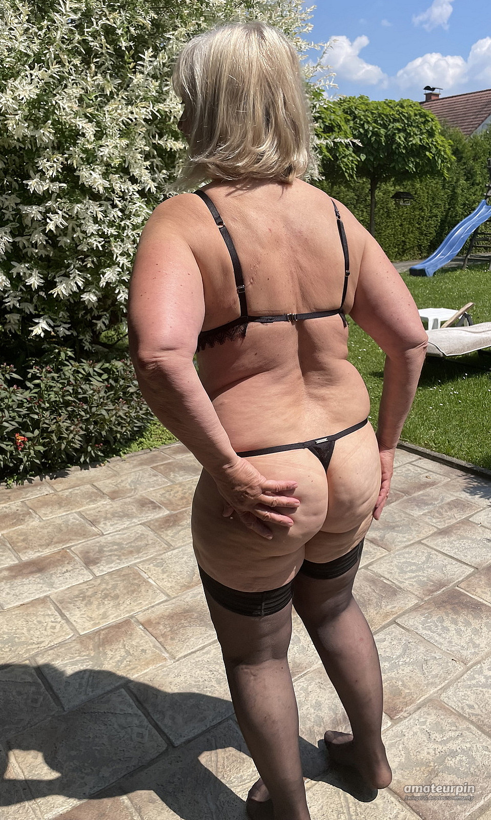 Na auf jedenfallSie zeigt sich sehr erotisch in dem Garten in scharfer Wäsche...heiße Frau