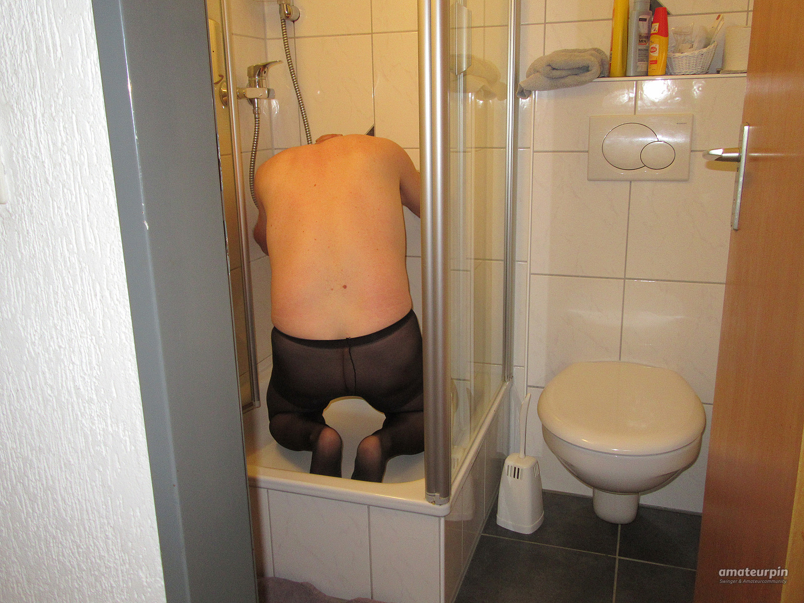 nackt in Strumpfhose unter die Dusche gezwungen muss er den Arsch präsentieren