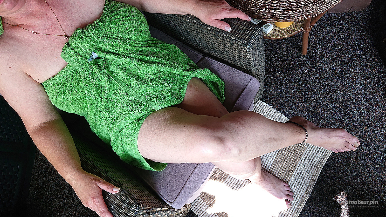 Im Garten geschuftet und geschwitzt. Da war eine Dusche echt nötig - damit man nicht so stinkt. Auch meine Muschi war vom schwitzen ganz klebrig und das mag ich gar nicht. Jetzt lüfte ich mein Handtuch auf der Veranda und mach FKK. Nackt ist Erholung.